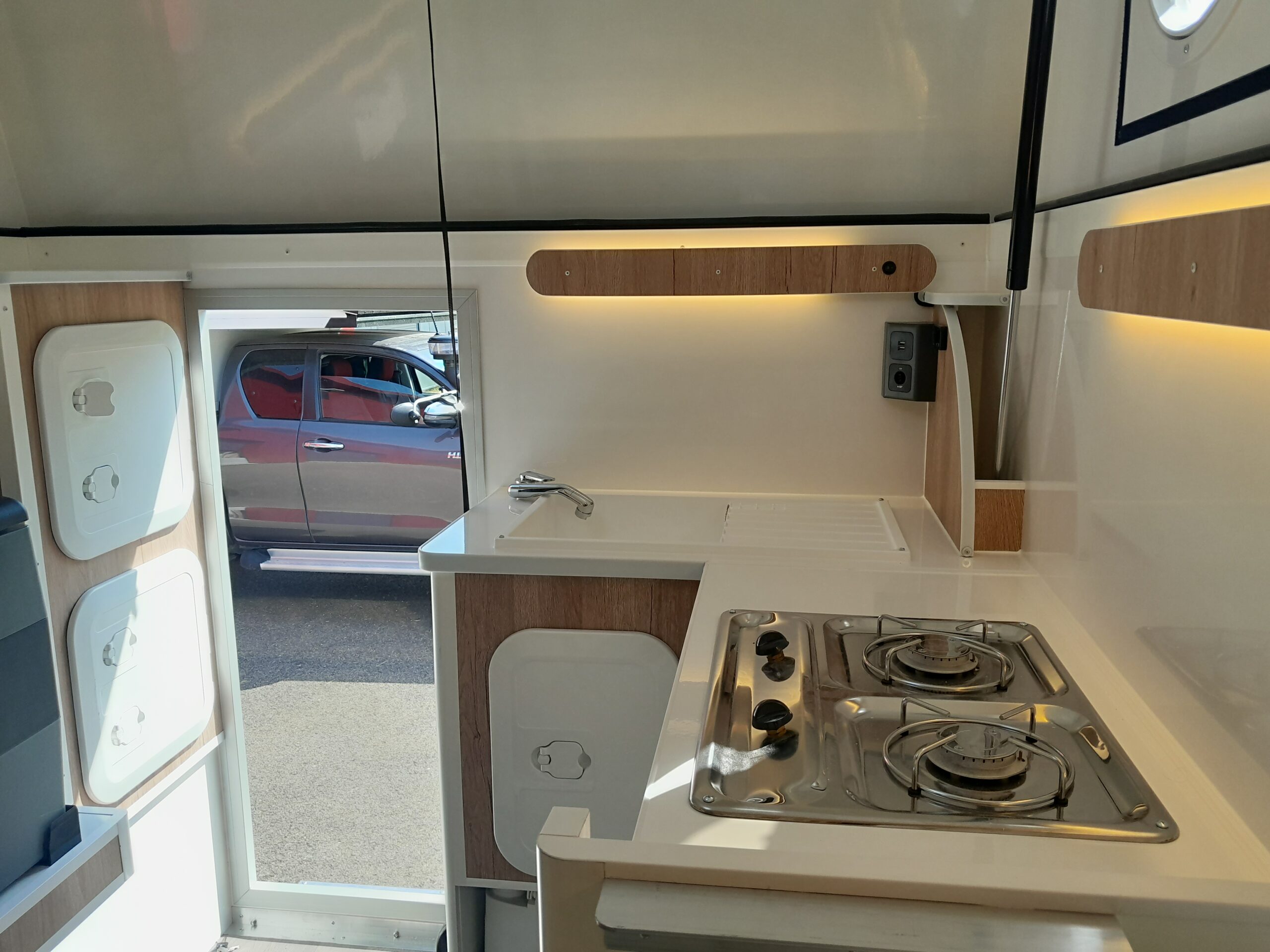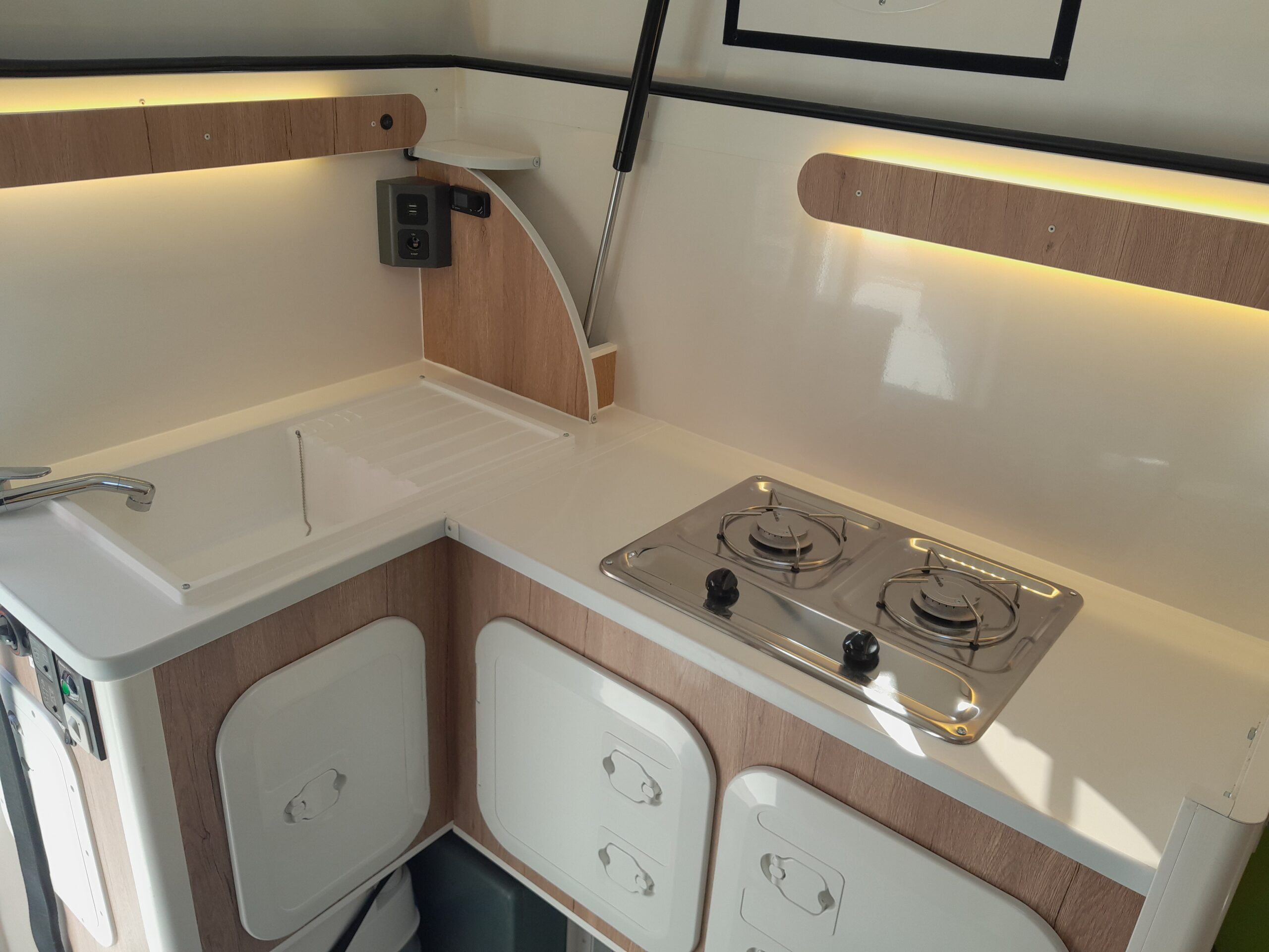 Dans la Delta V2, on y trouve un meuble de cuisine en angle qui permet d’avoir plus de plan de travail.